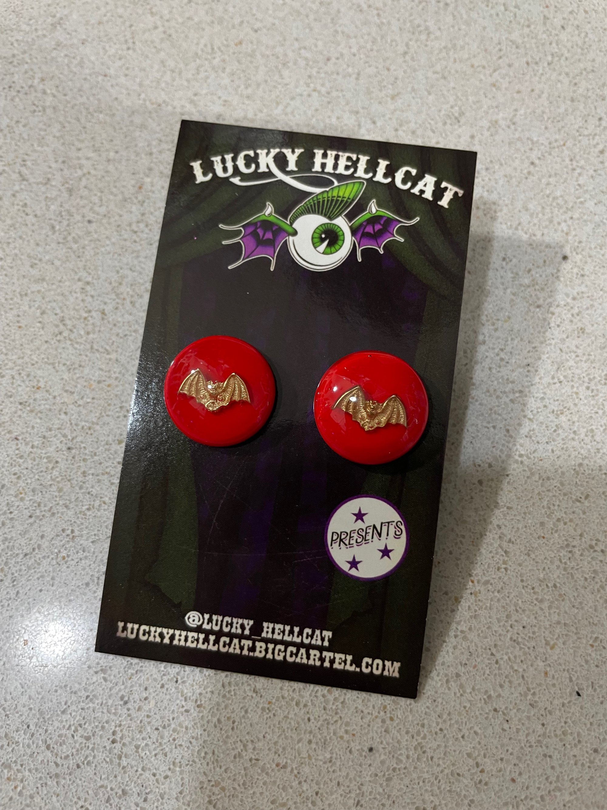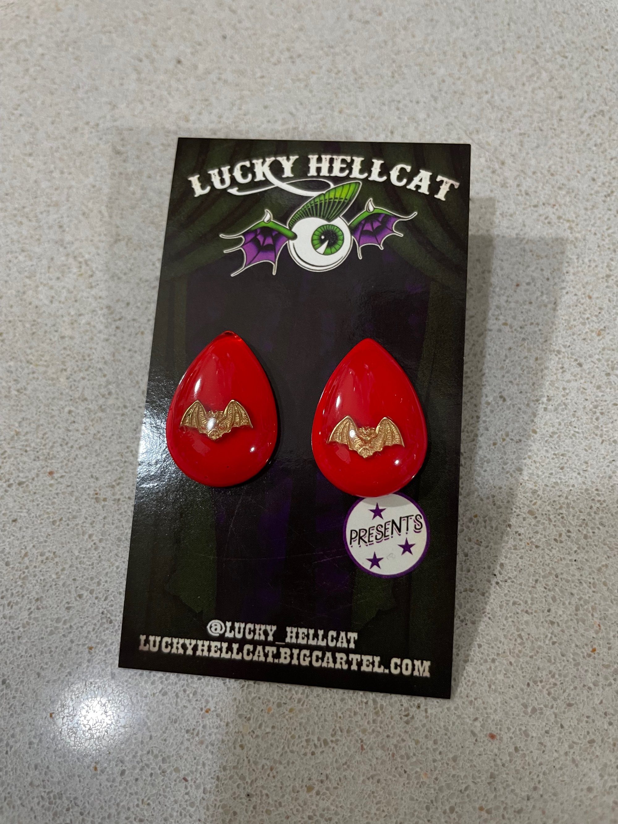 These are hand made with red pigment and adorned with a gold bat inside resin.