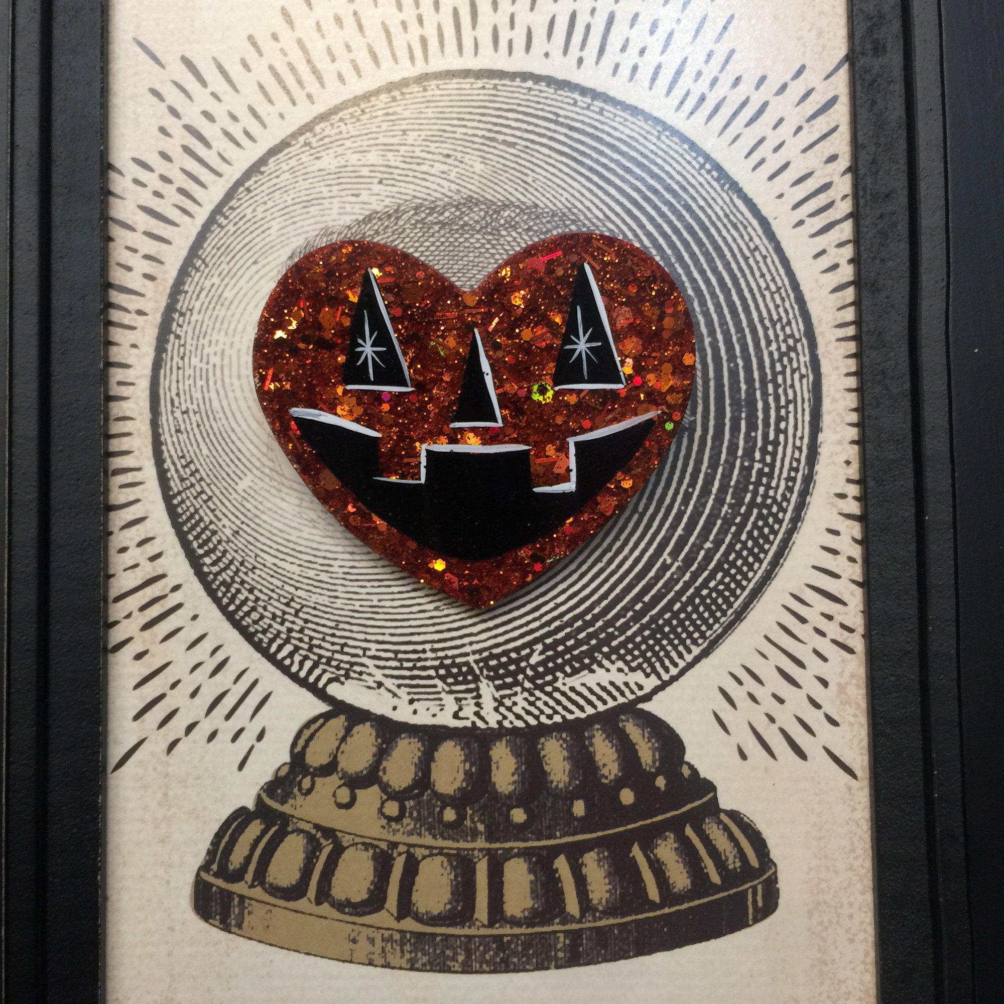 Thick Glitter Orange Heart with Hand Painted Face all 100% Hand Made 🖤🎃🧡 Brooch Back Measures 2.25" wide 2" tall